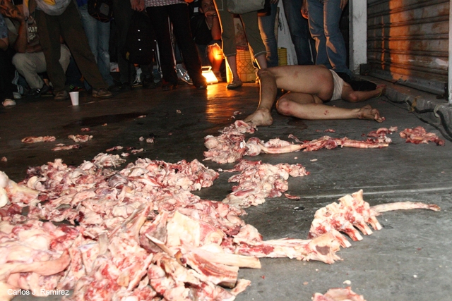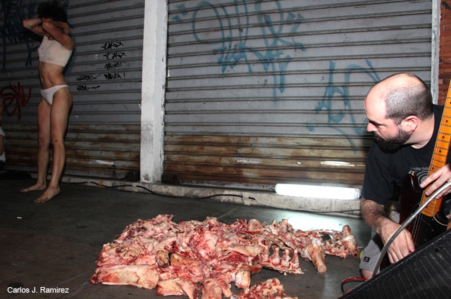 Se trata de un vistoso espectáculo conformado por dos personas, la joven que se revuelca entre pedazos de carne cruda y otro joven que descarga con su guitarra eléctrica distorsionada, con notas desesperantes que parecieran aleatorias. El espectáculo viene acompañado con el fuerte olor de la carne cruda semejante al que se puede percibir en un mercado de carnes abierto, lo cual hizo de esta una experiencia única.